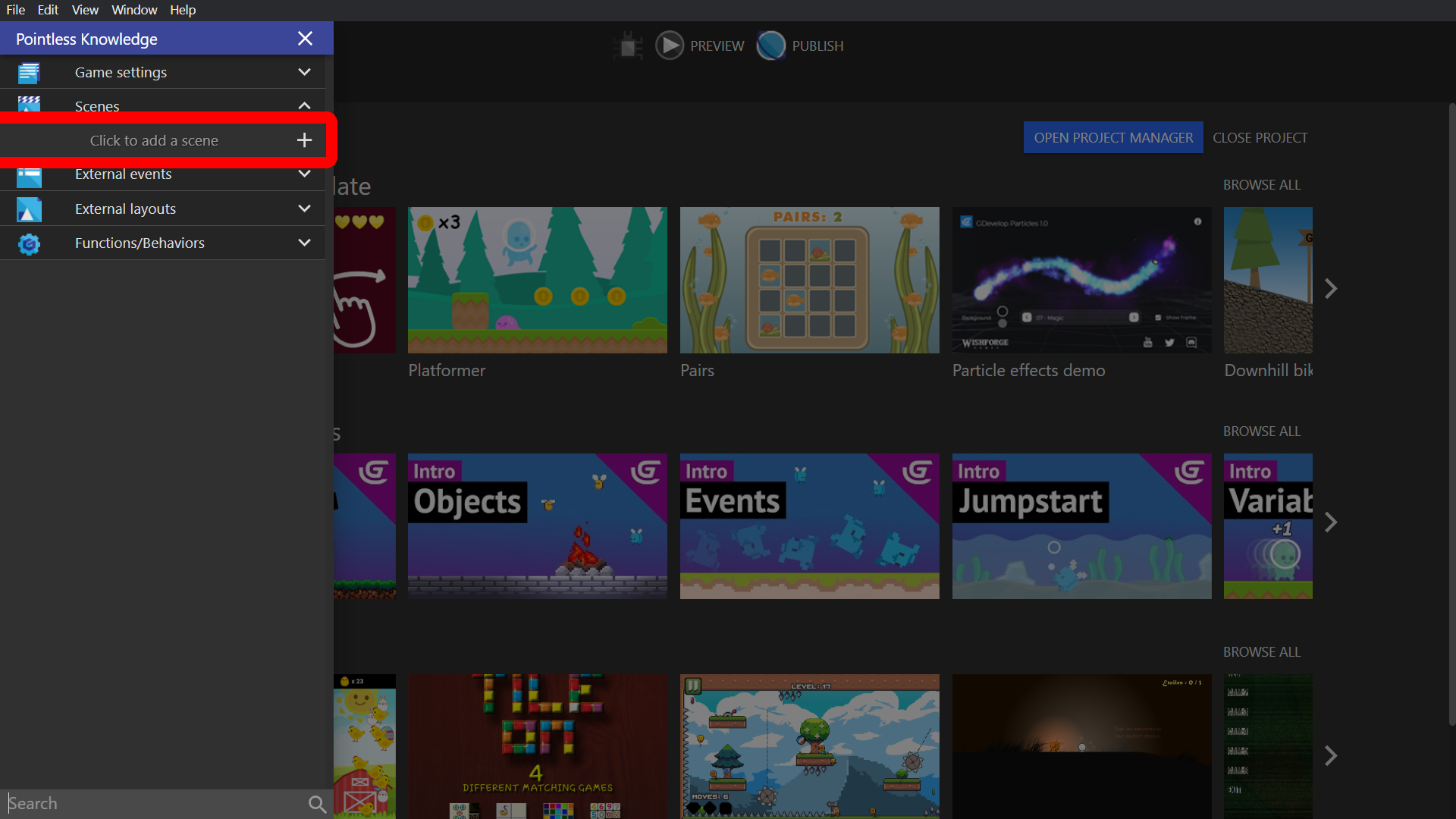 Open a blank game project in GDevelop